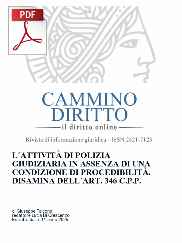 Judicial police activity without a condition of admissibility - Examination of article 346 of the Code of Criminal Procedure through the formants, doctrinal, legislative, and jurisprudential.Sommario: 1. Premessa; 2. Esegesi dell'art. 346 del C.p.p.; 3. Relazione dell'art. 346 del c.p.p. con le norme dell'Ordinamento giuridico; 4. Conclusioni.