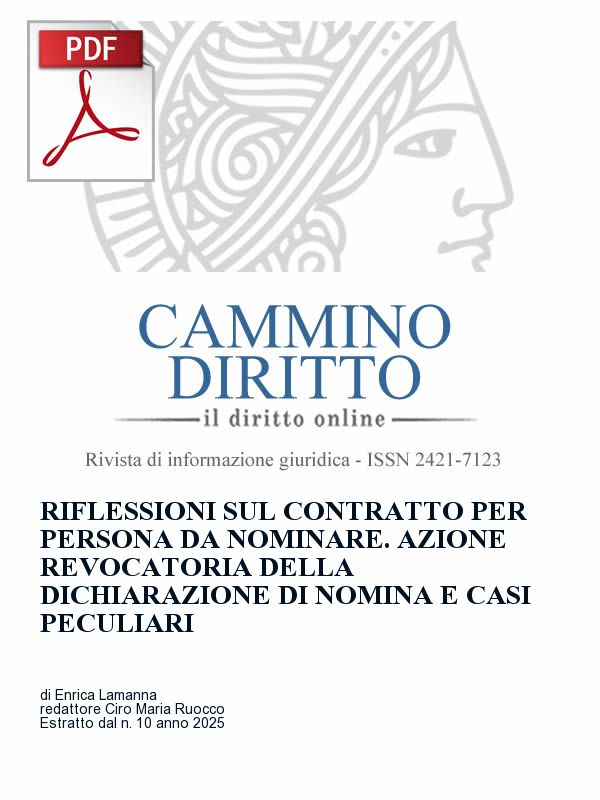 Sommario: 1. il contratto per persona da nominare; 2. differenze con altre fattispecie negoziali; 2.1. contratto per persona da nominare e cessione del contratto; 2.2. contratto per persona da nominare e contratto a favore di terzo; 2.3. contratto per persona da nominare e contratto per conto di chi spetta; 3. azione revocatoria della dichiarazione di nomina; 4. Conclusioni con riferimento a casi peculiari affrontati dalla giurisprudenza