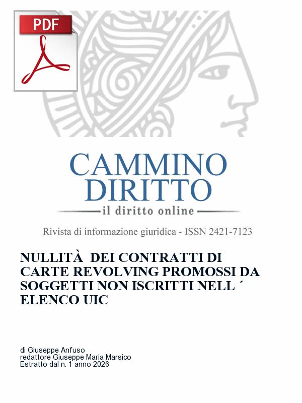 With judgment no. 12838 of 13 May 2025, the Italian Supreme Court held revolving credit card agreements null where they are promoted and signed at merchants not enrolled in the UIC register of financial agents, due to the breach of mandatory rules safeguarding the integrity of the financial system, anti-money-laundering purposes and consumer protection.Sommario: 1. Introduzione: la funzione nomofilattica e l’interesse pubblico alla regolarità dell’intermediazione. 2. Quadro normativo: D.Lgs. 374/1999 e D.M. 485/2001. 3. Qualificazione della carta revolving. 4. Riserva di attività e perimetro della deroga per i fornitori convenzionati. 5. Norma imperativa e nullità ex art. 1418 c.c. . 6. Il consolidamento degli orientamenti giurisprudenziali. 7. Effetti restitutori e interessi legali. 8. Considerazioni conclusive.