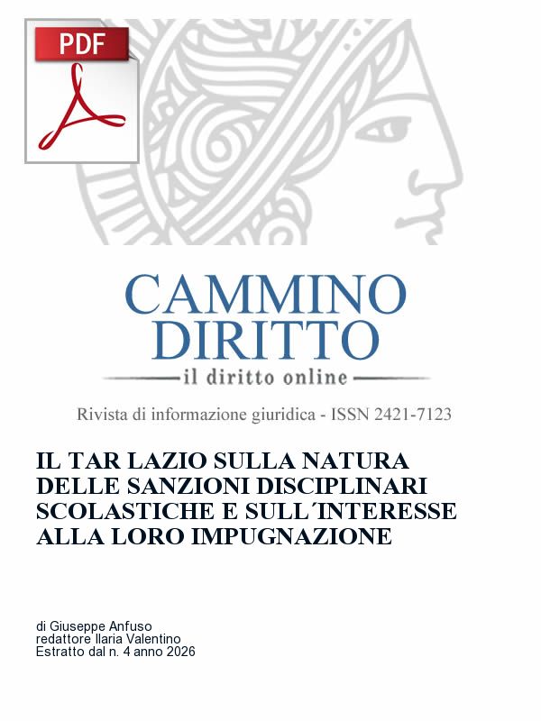 The commentary analyzes TAR Lazio judgment n. 22526/2025 on school disciplinary proceedings, examining the non-criminal qualification of educational sanctions according to Engel criteria, the exclusion of ne bis in idem between disciplinary sanctions and conduct grades, the application of the “more probable than not” evidentiary standard, and the operation of non-contestation and proximity of evidence principles. The decision confirms the established orientation on the educational nature of school disciplinary measures and the limits of judicial review over the cognitive-educational discretion of the Class Council.